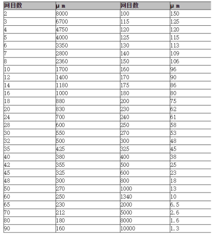 國際目數與微米對照表