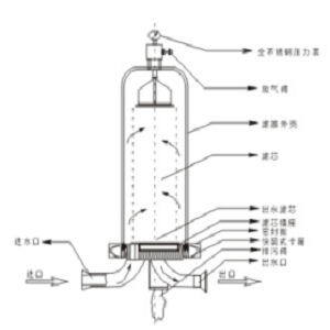 保安過濾器是由上蓋,濾芯,不銹鋼材質罐體,法蘭進出水口,排污口,排氣閥,壓力表,導流桿,不銹鋼支腳等設備構成。在設備工作壓力的作用下,原液進入進水口,通過濾材,濾渣被濾芯留在管壁上,干凈的濾液透過濾材從出水口流出,最終達到過濾的目的。